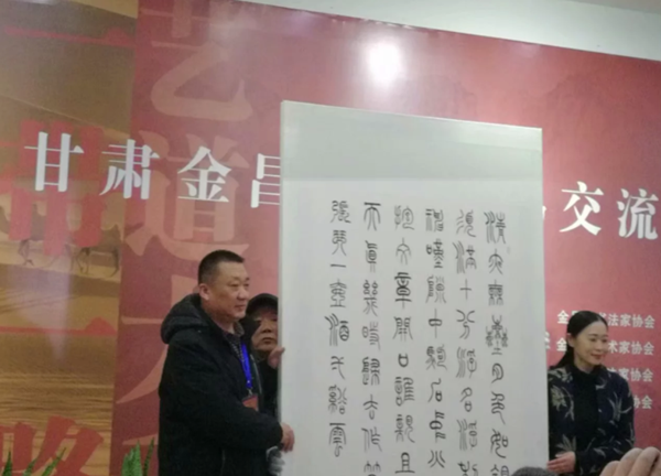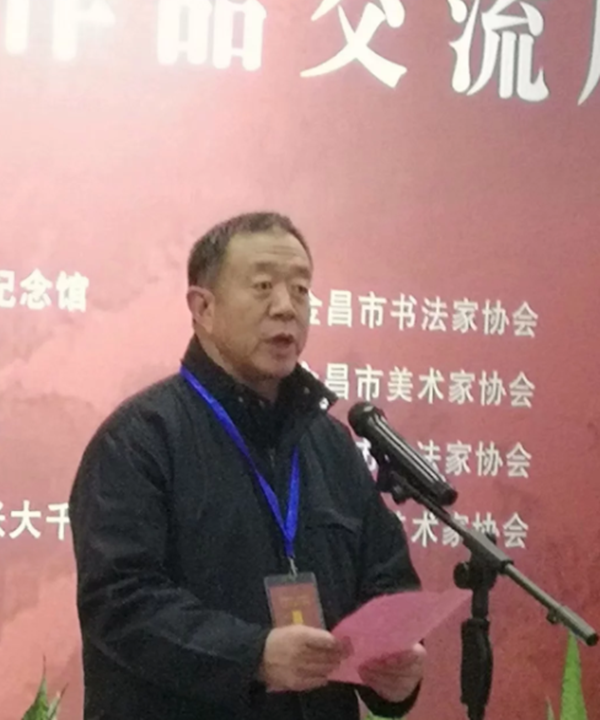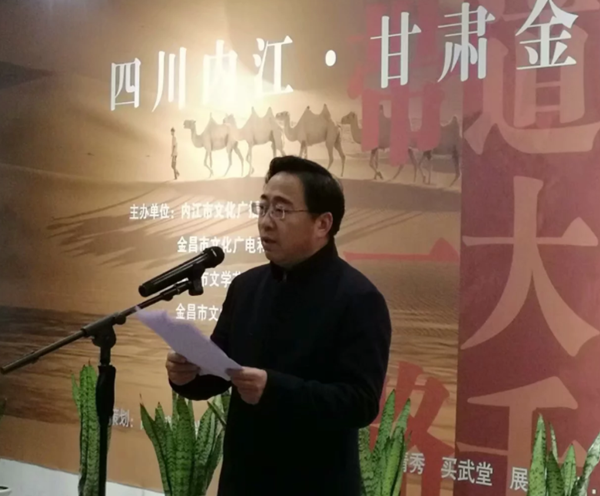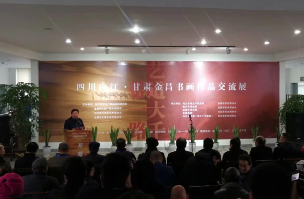 甘肃金昌市文化广电和旅游局副局长王兴成代表金昌书画艺术家对内江书画艺术界的盛情邀请表示感谢。他介绍说,这是金昌与内江首届合作书画作品交流展,为推动两地深厚文化底蕴,感受河西走廊,戈壁绿洲、丝路花雨艺术风范和大千故里,大千艺术之风彩,两地艺术家扎根生活,根植传统,笔随时代,用饱含激情的笔墨绘就艺术语言,并讴歌出新中国成立70周年的辉煌。此次文化“走亲”,促进了内江和金昌两地的文化交流,推进了两地的文化事业繁荣发展。