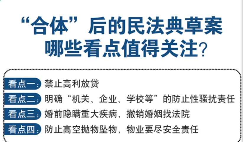 从明确禁止高利放贷、进一步完善防止性骚扰有关规定,到合理确定无效婚姻的情形、完善高空抛物坠物责任规则,民法典草案的诸多新看点值得关注。