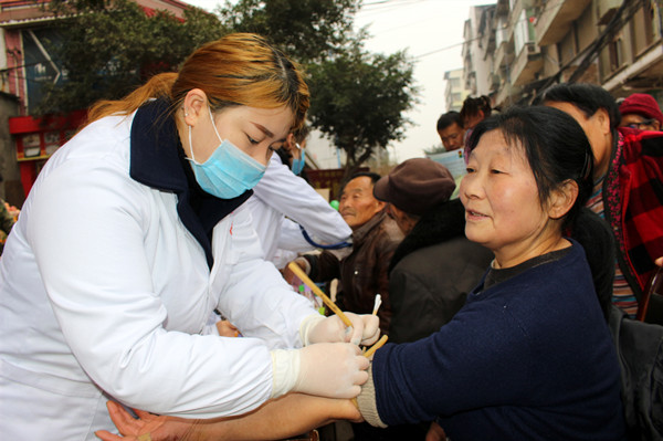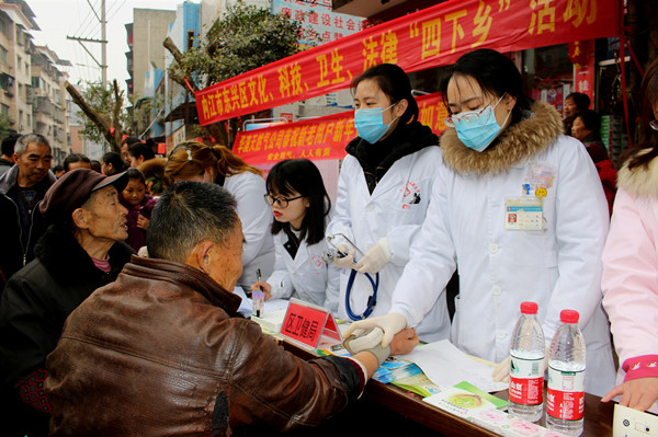 1月14日,在内江市东兴区白合镇场镇,白合中心卫生院的医护人员认真为赶集群众量血压、测血糖,免费为群众诊断、处方。