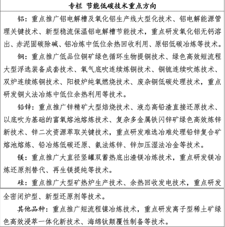 此外,《实施方案》要求加强关键技术攻关。研究有色金属行业低碳技术发展路线图,开展余热回收等共性关键技术、氨法炼锌等前沿引领技术、原铝低碳冶炼等颠覆性技术攻关和示范应用。强化企业创新主体地位,支持企业联合开展低碳技术创新和国际技术合作交流。围绕绿色冶金等重点领域,建设有色金属低碳制造业创新载体。推广绿色低碳技术。大力推动先进节能工艺技术改造,重点推广高效稳定铝电解、铜锍连续吹炼、蓄热式竖罐炼镁等一批节能减排技术,进一步提高节能降碳水平。对技术节能降碳项目开展安全评估工作。