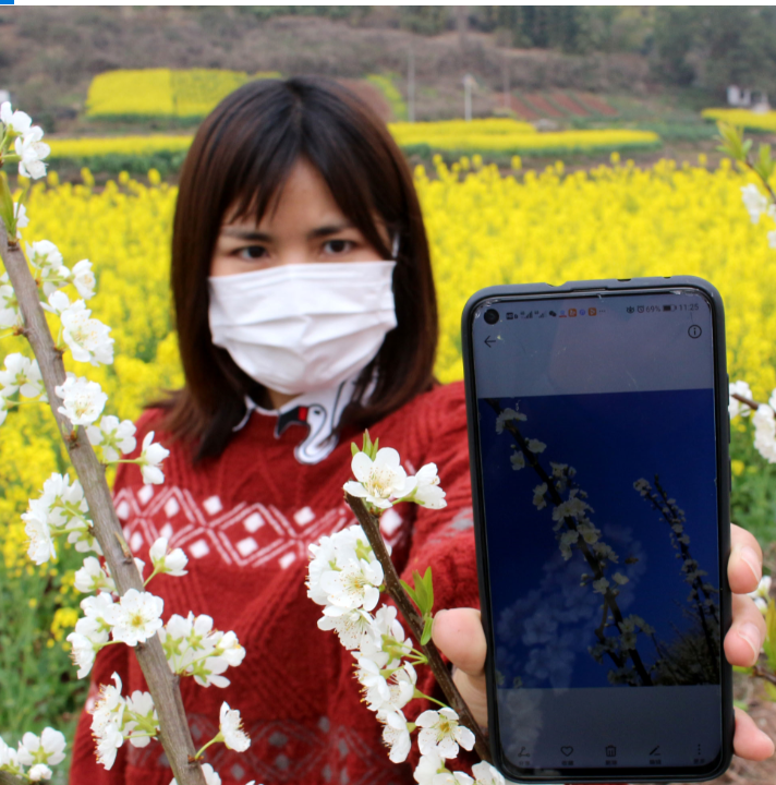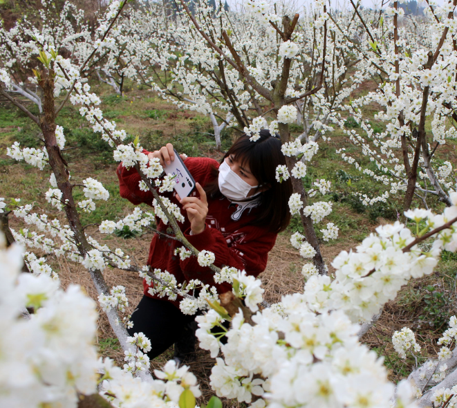 3月1日,在内江市东兴区白合镇杨林村,当地宣传干部在盛开的李花丛中赏景晒花。