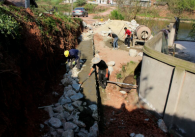 3月19日,在内江市东兴区永兴镇半坡村,筑路民工正在修砌通村公路挡墙。