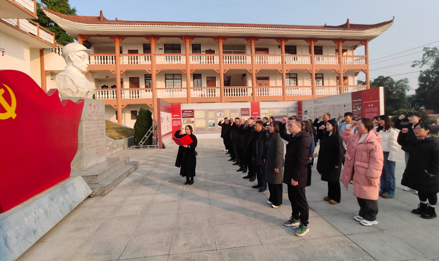 活动在庄严肃穆的氛围中拉开序幕。全体教师在罗世文烈士雕塑前整齐列队,向罗世文烈士深深鞠躬致敬。鲜红的党旗在寒风中猎猎作响,教师们面向党旗重温入党誓词:“我志愿加入中国共产党……为共产主义奋斗终身,随时准备为党和人民牺牲一切,永不叛党!”铿锵誓言回荡在纪念馆上空,字字千钧,既是对英烈的告慰,更是对初心的坚守。