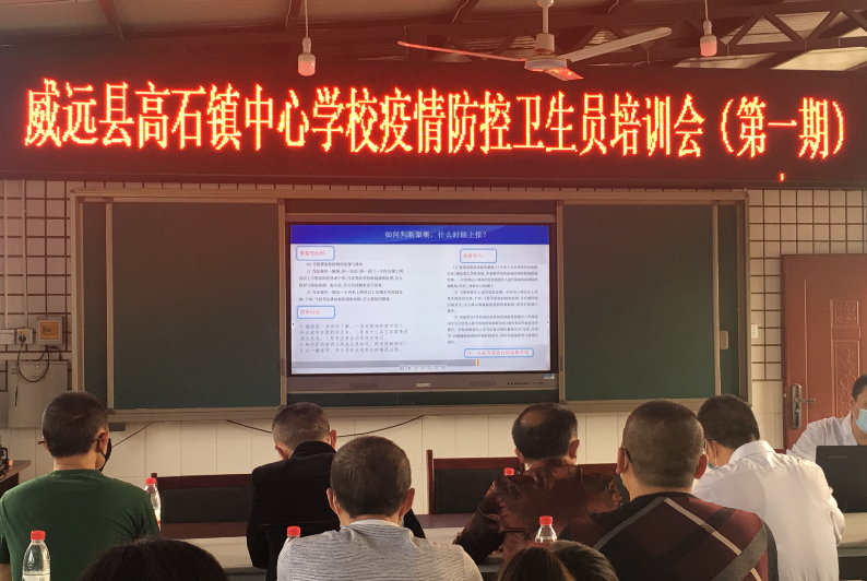 为全面提升镇内各校应对新冠肺炎疫情防控工作专(兼)职人员的防控知识与技能,把学校疫情防控各项工作抓紧抓细抓实际,按照《威远县教育和体育局威远县卫生健康局关于进一步做好疫情防控卫生员免费培训的通知》(威教体联发[2020]28号)要求,威远县高石镇中心学校于3月25日组织开展学校疫情防控卫生员培训会。
