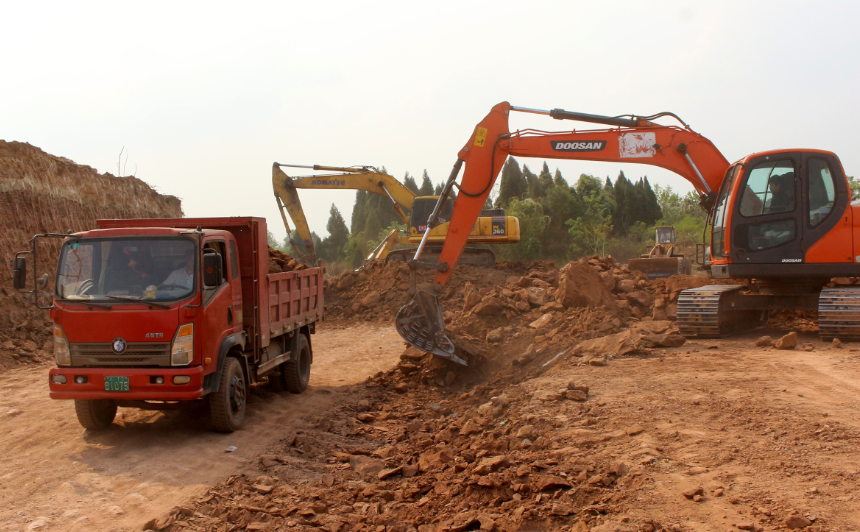3月24日,在内江市东兴区白合镇交通村,施工机械正在“万头生猪创业园”项目实施地“十八山”平场,现场一派繁忙景象。