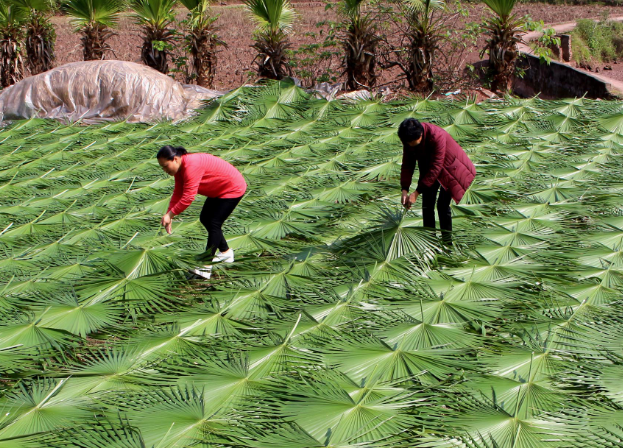 3月31日,在内江市东兴区郭北镇放生桥村,当地农户抓住晴好天气收割、晾晒蒲葵。