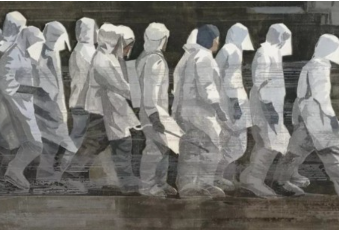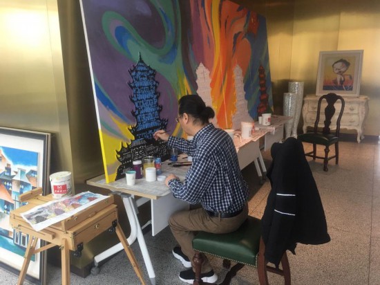 上海民间文艺家协会主席李守白的作品《向心力·中国力量》整幅作品高1.6米,长4米,采用布面油画结合剪纸雕版工艺制作而成。作品以武汉地标黄鹤楼为主背景,根据疫情发展的不同阶段,以黄鹤楼上空的元素变化为主线,体现了中国人民积极抗疫的进程。