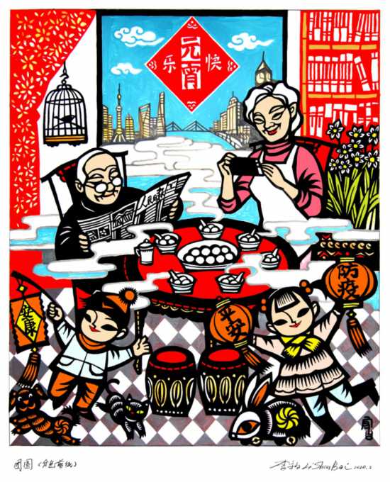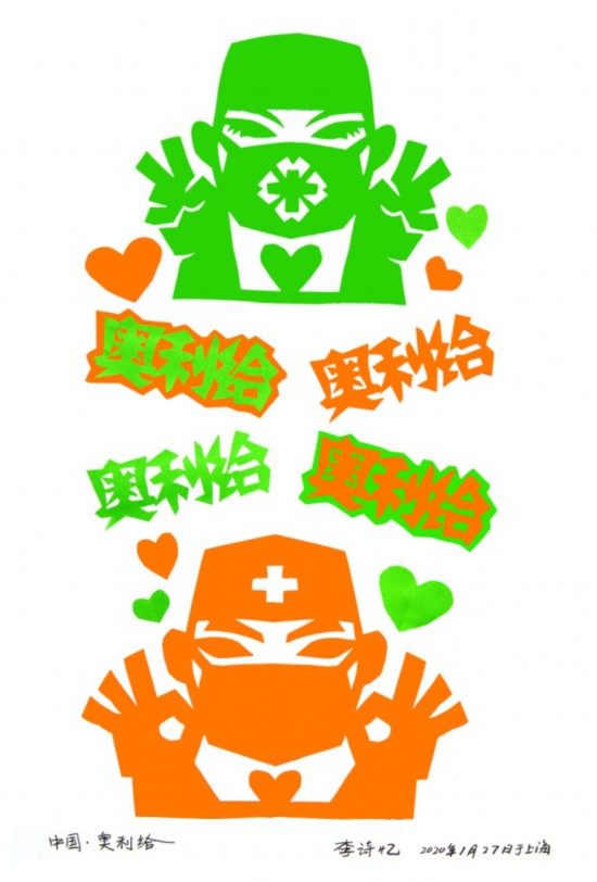 李守白在创作大幅作品《向心力·中国力量》的同时,还专门创作了2幅作品《中国精神·上海速度》和《团圆》,作品画面丰富、技艺精湛,展现他一贯的艺术风格。而他的女儿、90后剪纸艺术家李诗忆则利用网红语“奥利给”创作了剪纸作品《中国·奥利给》,以90后特有的艺术风格为抗击疫情加油呐喊。