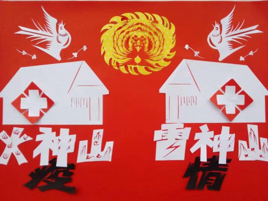 此外,不少作品以中华传统神话为题材,富有民间传统特色,表达美好祝愿和坚定决心。77岁的剪纸大师赵子平老先生也积极投身抗疫主题创作。他的剪纸作品《凤凰涅槃》,巧妙地将传统元素与现实表达结合起来。作品以凤凰涅槃的传统形制为创作基础,但涅槃的主体凤凰化为了火神山和雷神山。