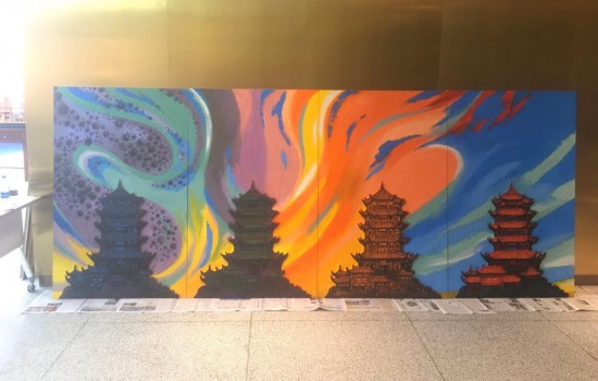 全画共分四个子画面,既互为独立,又相互关联。从左侧画面黄鹤楼上空乌云密布,疫情肆虐开始;然后乌云变为了红十字,代表全国驰援武汉;画面3用六种不同文字、语言的“加油”和“谢谢”表达对全世界支持中国抗疫事业的感谢以及我们必将取得抗疫胜利的信心和决心;最后蓝天下的黄鹤楼渐渐恢复生态,仙鹤归来。