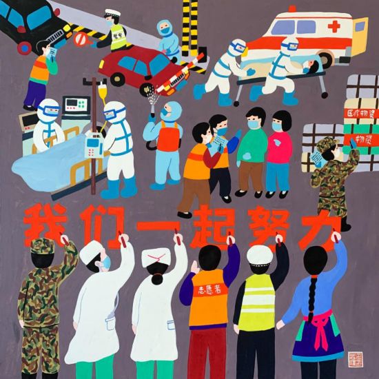 奉贤撕纸艺术家何球红、何玉玮父子,也精心创作了作品《防控疫情 从我做起》和《守护者》。宝山吹塑版画艺术家龚赣弟创作作品《前进,进!》向奋战在抗疫一线的医护工作者致敬,他的徒弟杨秀仙创作吹塑版画《奋战火神山》,用艺术的手法刻画火神山医院如火如荼的建设景象。金山农民画家金兴健和周晓丹夫妻,以基层抗疫为主题,分别创作了作品《有你真好》和《我们一起努力》,生动展现了基层工作者的不懈坚守与无私奉献。