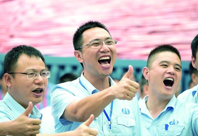 7月23日,在中国文昌航天发射场测控大厅,航天科技人员庆祝发射成功。新华社记者 才扬摄