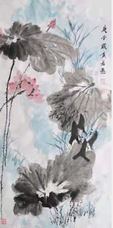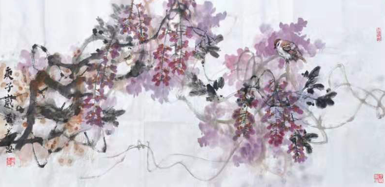 黄若愚教授近期的写意花鸟画,在淡墨的用笔勾线中求干笔、枯笔,彰显出焦墨渴墨力透纸背如锥画沙的苍劲豪放,淡湿的泼墨中皴擦干裂变化的笔墨肌理,巧置密不透风疏可走马的虚实画面,构图、笔墨、空白……透露出空灵的禅意。
